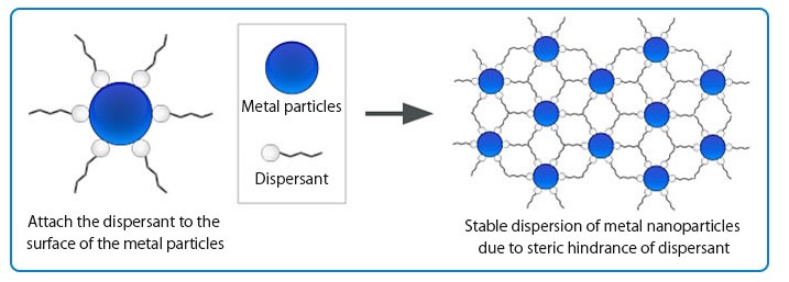 - Metal nanoparticle inks active in printed electronics applications in semiconductors.
